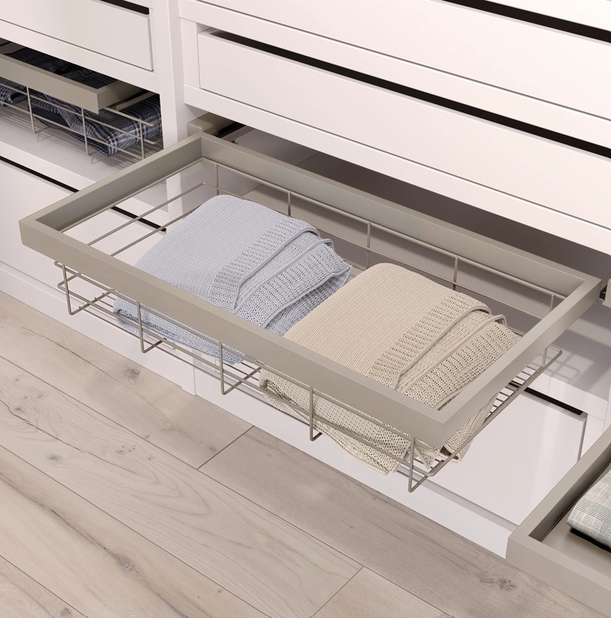 Zestaw składający się z drucianej szuflady i ramy z prowadnicami, zaprojektowany, aby przemienić Twoją szafę lub garderobę w przestrzeń pełną elegancji i doskonałej organizacji. Nasz produkt jest idealnym rozwiązaniem dla tych, którzy poszukują zarówno funkcjonalności, jak i estetycznego wykończenia, przy jednoczesnym rozwiązaniu problemu przechowywania w domu.