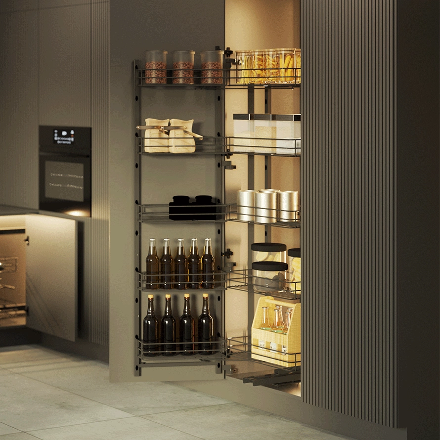 Cargo Maxi Space Duo to innowacyjne rozwiązanie do organizacji strefy przechowywania. System przypomina lodówkę, półki umieszczone są w nim zarówno wewnątrz szafki jak i po wewnętrznej stronie frontu, co gwarantuje łatwiejszą organizację i dostęp do przechowywanych w nich rzeczy. Wewnętrzne kosze dodatkowo przesuwają się do przodu podczas otwierania drzwi. Wysokość zawieszenia półek można dostosować do własnych potrzeb i gabarytów produktów. Cargo występuje w czterech wersjach kolorystycznych: z pełnymi koszami w eleganckiej czerni z dekorem drewnianym, ponadczasowej bieli ze szkłem oraz w wersji klasycznej z ażurowymi koszami w kolorze grafitowym lub chromie. Uniwersalna konstrukcja umożliwia montaż zarówno w szafkach lewych, jak i prawych, a montując obok siebie dwa systemy otwierane na obie strony uzyskujemy bardzo pojemną spiżarkę, gdzie wszystkie przechowywane rzeczy mamy w zasięgu wzroku. Stabilna konstrukcja, ponadczasowa kolorystyka, pojemność i funkcjonalność sprawiają, że Cargo Maxi Space Duo znajdzie zastosowanie w każdym wnętrzu, nie tylko w kuchni, ale także w pomieszczeniu gospodarczym, spiżarni, pralni czy garderobie.