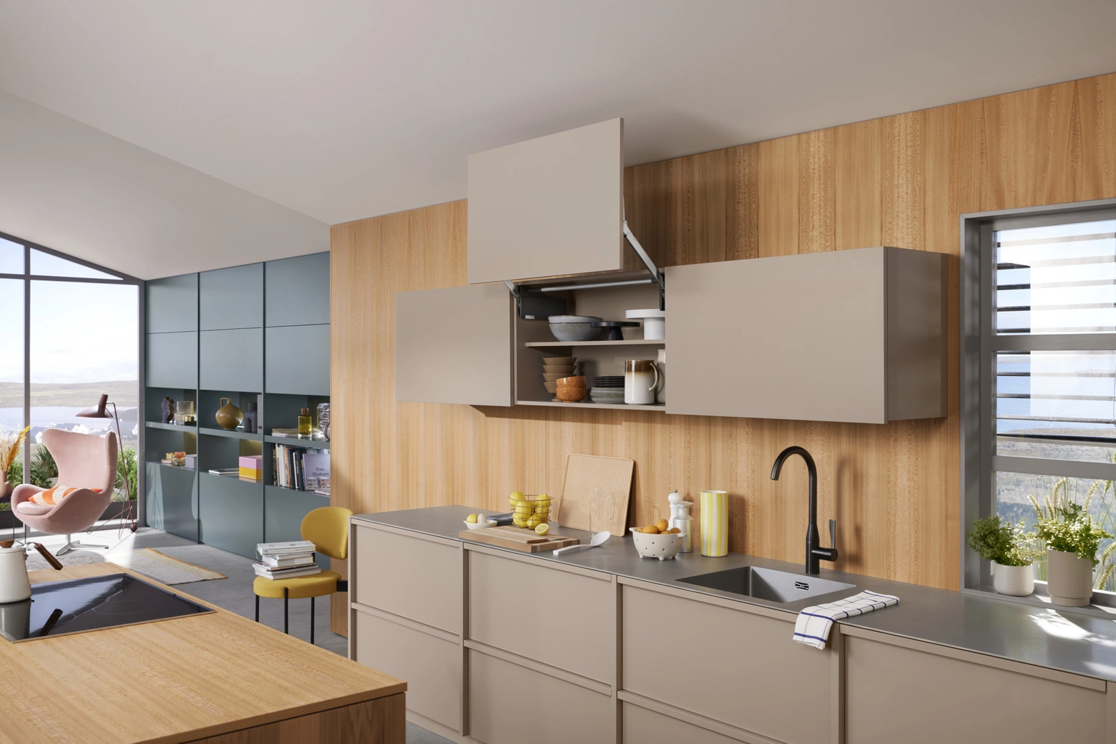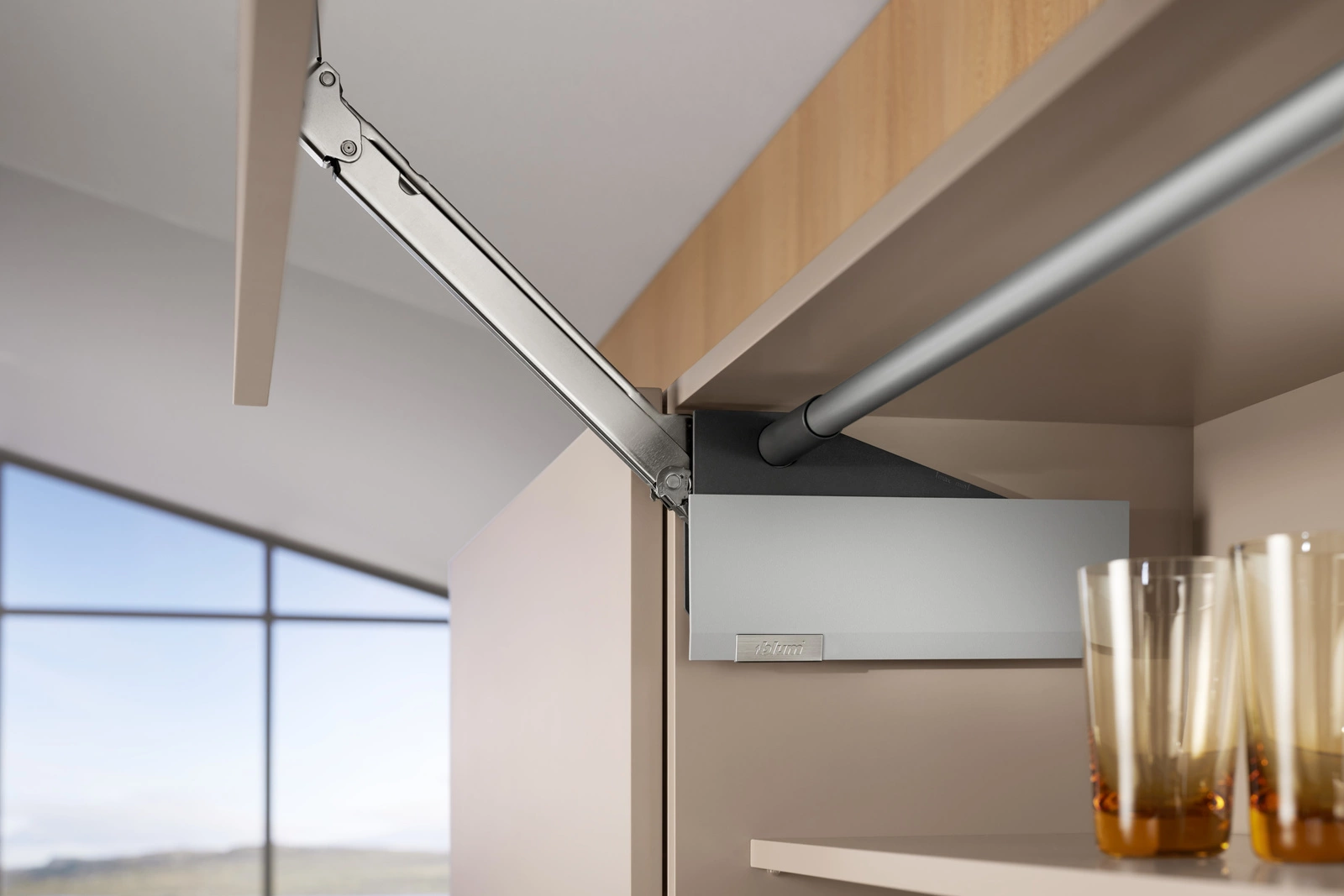 Przykład Zastosowania: System AVENTOS HL Top świetnie sprawdza się w szafkach kuchennych, w których konieczne jest zapewnienie pełnego dostępu do wnętrza przy ograniczonych przestrzeniach, takich jak szafki nablatowe, w których sprzęt AGD czy akcesoria mogą być łatwo schowane i dostępne na wyciągnięcie ręki.