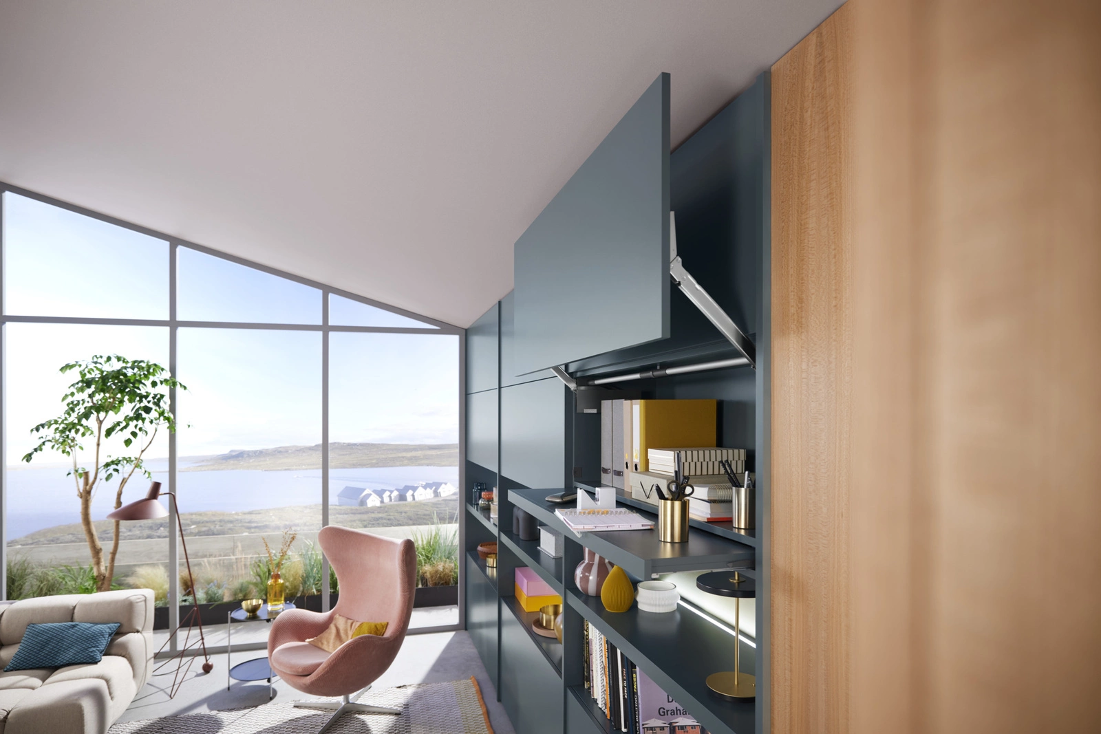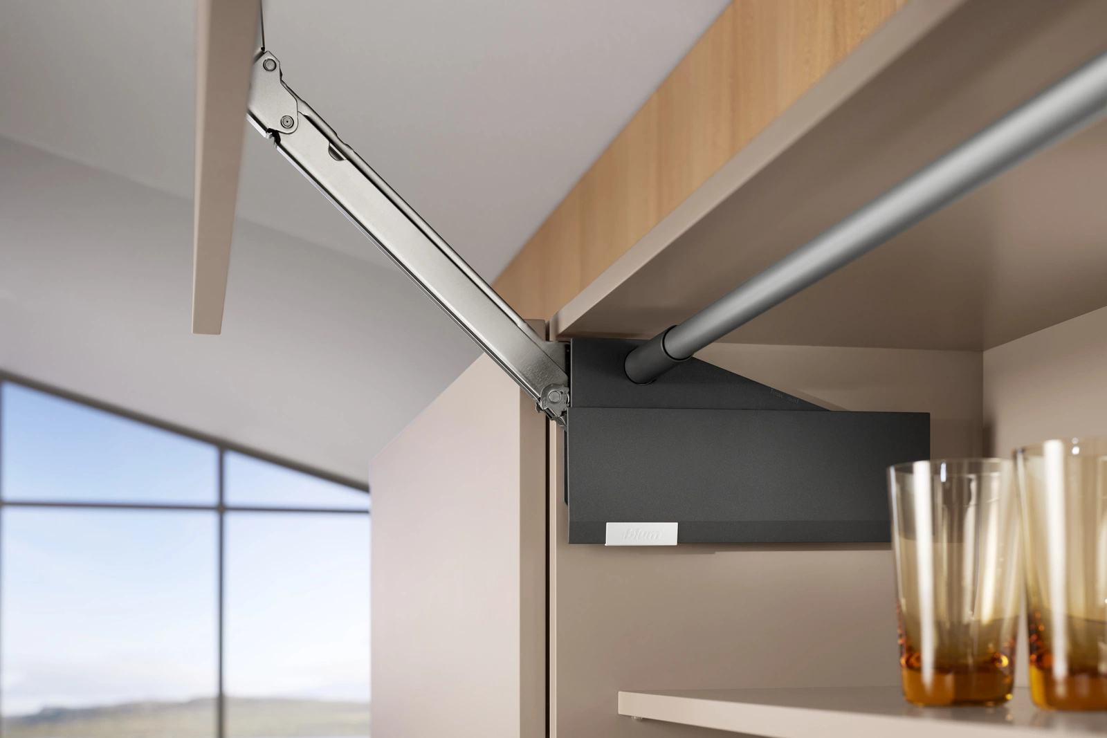 Przykład Zastosowania: System AVENTOS HL Top świetnie sprawdza się w szafkach kuchennych, w których konieczne jest zapewnienie pełnego dostępu do wnętrza przy ograniczonych przestrzeniach, takich jak szafki nablatowe, w których sprzęt AGD czy akcesoria mogą być łatwo schowane i dostępne na wyciągnięcie ręki.