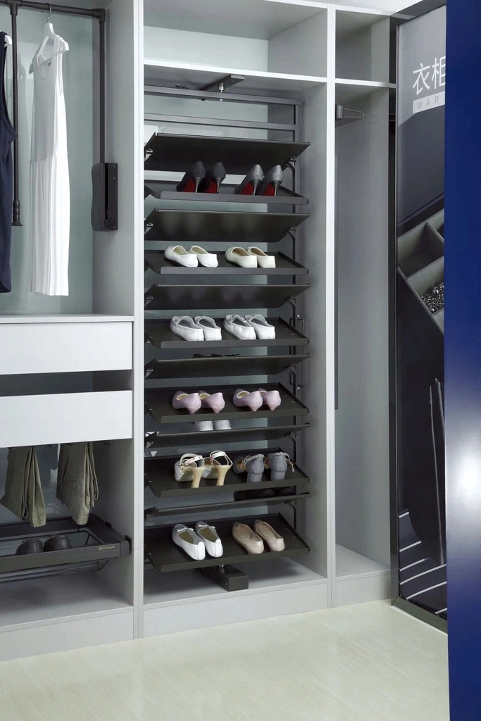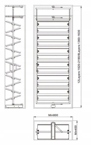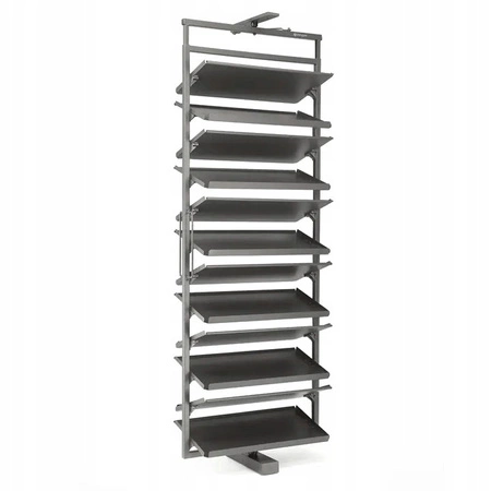 - Wysoki kosz obrotowy cargo na buty do szafki 800 mm z 12 poziomami przechowywania. Pełny obrót 360°, półki metalowe, cichy domyk