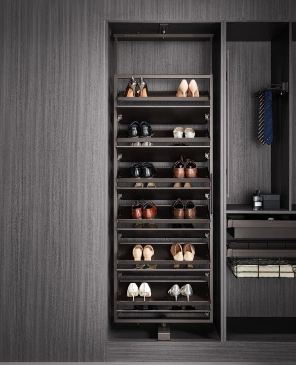 Pojemność XL: 12 metalowych półek dostępnych z obu stron pomieści aż do 36 par butów.