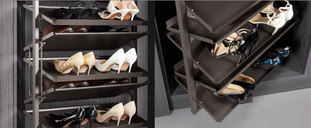 Płynny Obrót 360°: Umożliwia łatwy i szybki dostęp do każdej pary butów, ponieważ cała zawartość "wyjeżdża" do użytkownika jednym ruchem.