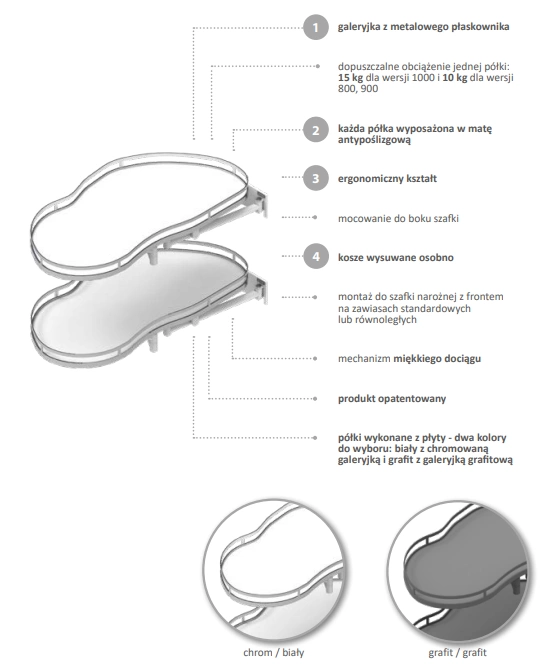 Mechanizm Miękkiego Dociągu: Wyposażony w odbojnik, który gwarantuje ciche i płynne domykanie półek.