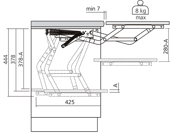 System ten jest łatwy w obsłudze, a jego działanie opiera się na wysuwaniu i podnoszeniu blatu, wspomaganym przez sprężyny naciągowe. Blat automatycznie blokuje się w odpowiedniej pozycji, a odblokowanie następuje po lekkim podniesieniu go do góry. Okucie jest przewidziane do szafek o szerokości od 350 mm do 600 mm, opcjonalna szerokość montażowa wynosi od 300 do 568 mm, ponieważ oba ramiona są całkowicie oddzielone od siebie.