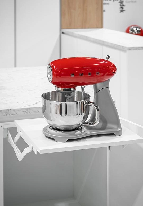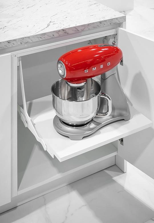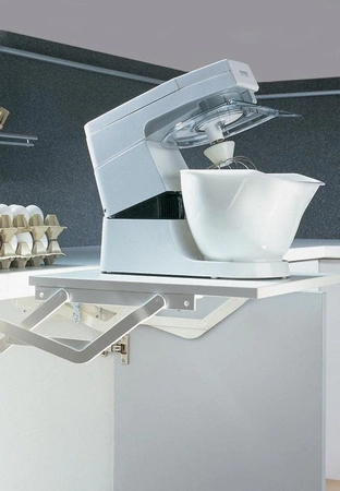 Mechanizm wysuwanego blatu miksera to innowacyjne rozwiązanie, które pozwala na ustawienie drobnego sprzętu AGD, takiego jak mikser kuchenny, na poziomie powierzchni roboczej. Gdy urządzenie nie jest potrzebne, można je jednym ruchem schować do szafki za frontem.