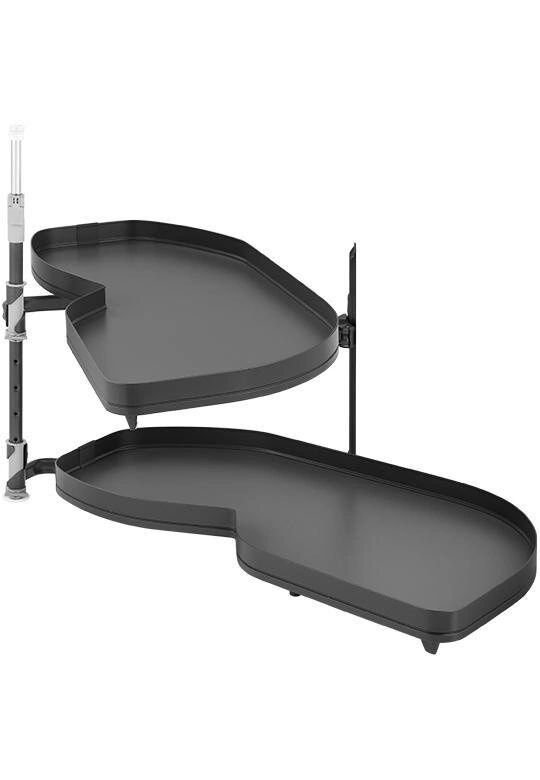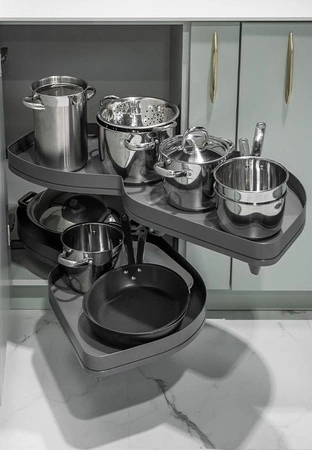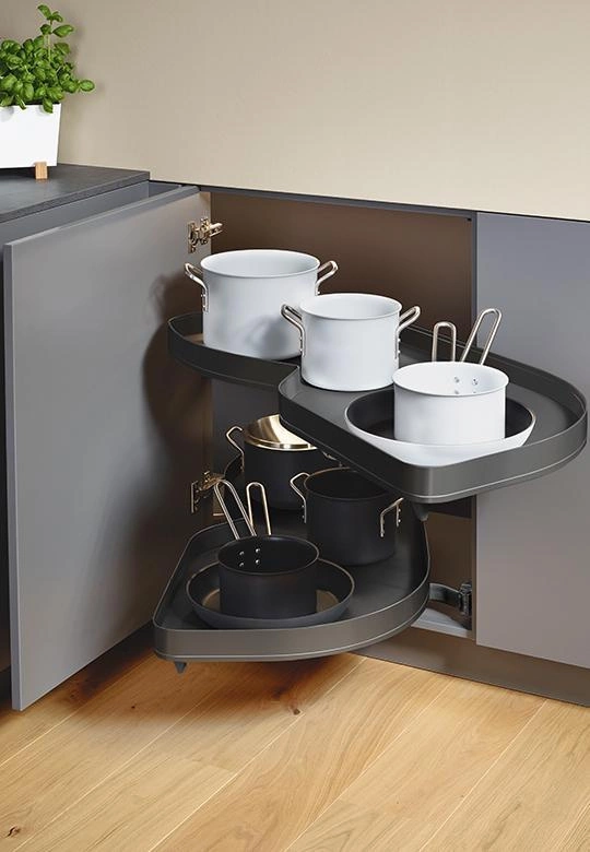 LeMans II to nowoczesne okucie meblowe, które dzięki dwóm niezależnym, ruchomym półkom całkowicie wysuwanym z wnętrza szafki, znacząco ułatwia organizację i dostęp do przechowywanych akcesoriów kuchennych. Wystarczy otworzyć front pod kątem 85°, by płynnie wysunąć półki na zewnątrz – szybko, wygodnie i ergonomicznie.