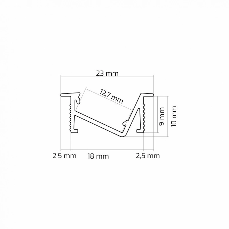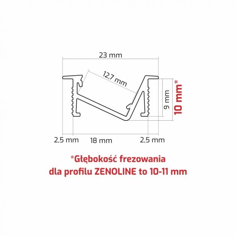 Profil Zenoline o długości 2 metrów jest wykonany z wysokiej jakości anodowanego aluminium. Można w nim zastosować taśmę LED o maksymalnej szerokości 10mm. Produkt montuje się do wpustu, czyli do odpowiednio wykonanego otworu lub frezu w powierzchni montażowej, np. w płycie meblowej. Głębokość frezowania* to 10-11mm.