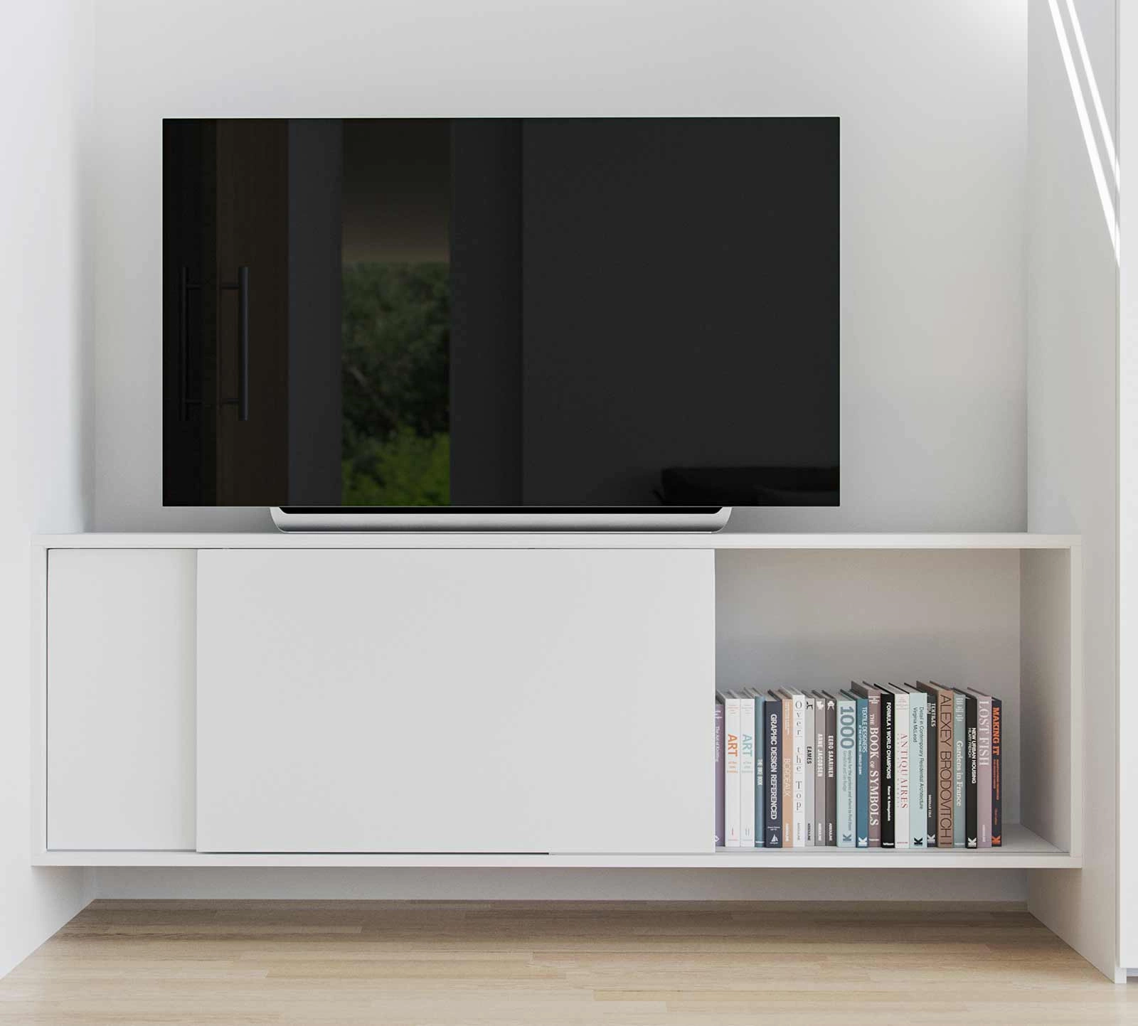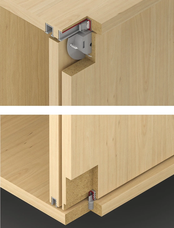 Zestaw pozwala na wykonanie frontów przesuwnych w układzie Infront – pozycja drzwi po zamknięciu znajduje się w jednej płaszczyźnie z korpusem mebla. System pracuje na górnym torze jezdnym z regulowanymi wózkami, natomiast dolne prowadzenie realizowane jest w sposób punktowy – bez widocznych elementów na podłodze.