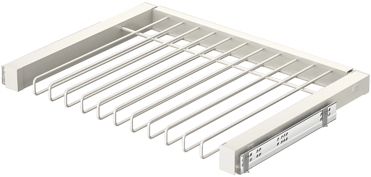 Praktyczne rozwiązanie do przechowywania spodni w garderobach i szafach. Umożliwia wygodny dostęp od przodu oraz elastyczne rozmieszczenie w systemie modułowym 32 mm.