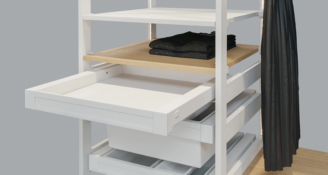 Element umożliwiający przekształcenie ramy wysuwanej Hafele Dresscode w pełnowartościową szufladę. Dzięki otworom montażowym z jednej strony, możliwe jest zamocowanie ramy zewnętrznej (np. z frontem wewnętrznym).