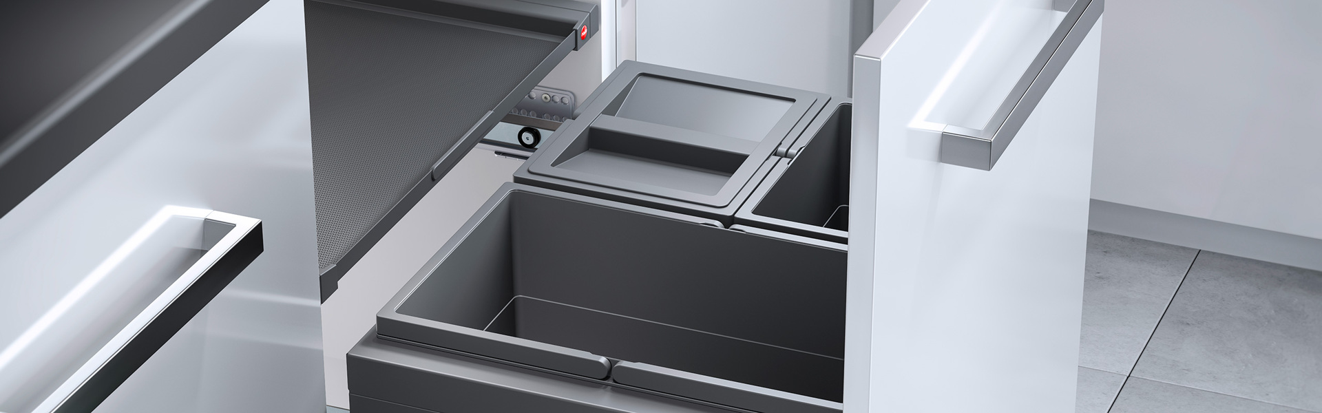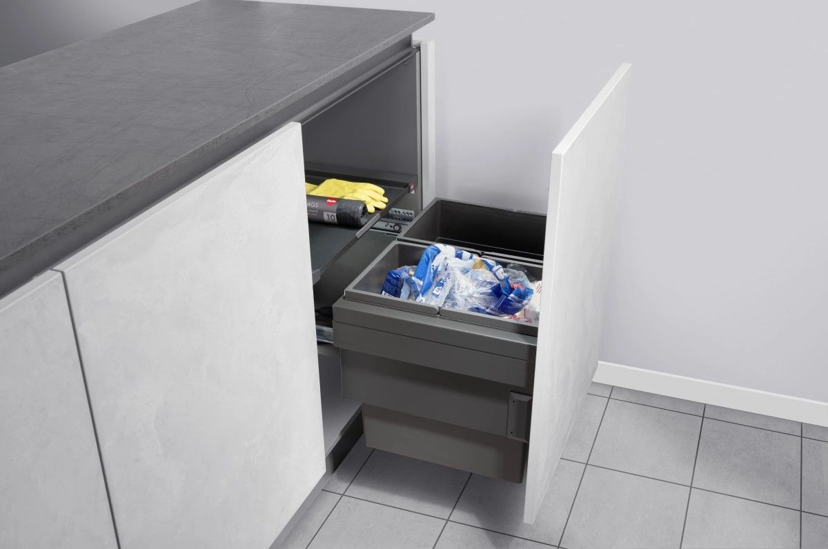 Profesjonalny system do segregacji odpadów w szafkach kuchennych o szerokości 600 mm z frontem na zawiasach. Dwa pojemniki po 28 litrów zamontowane na prowadnicach z pełnym, zsynchronizowanym wysuwem i cichym domykaniem