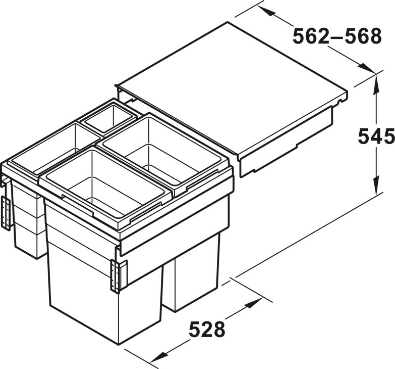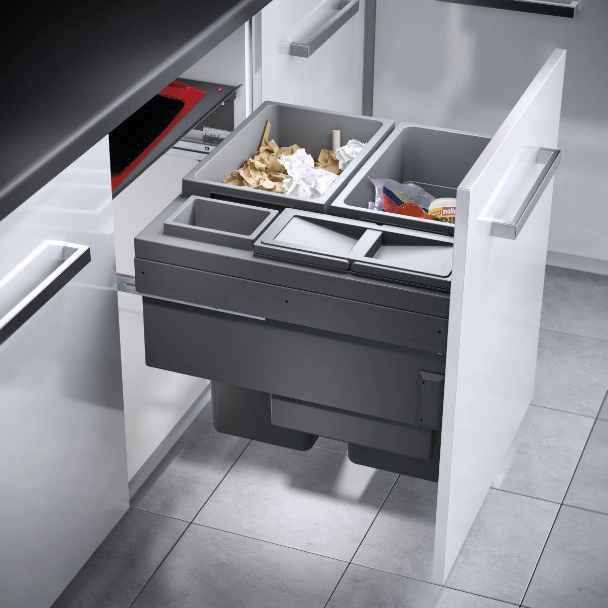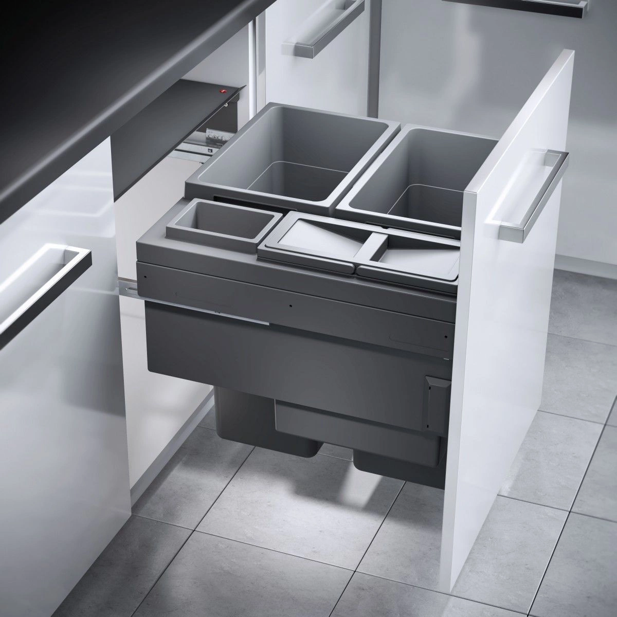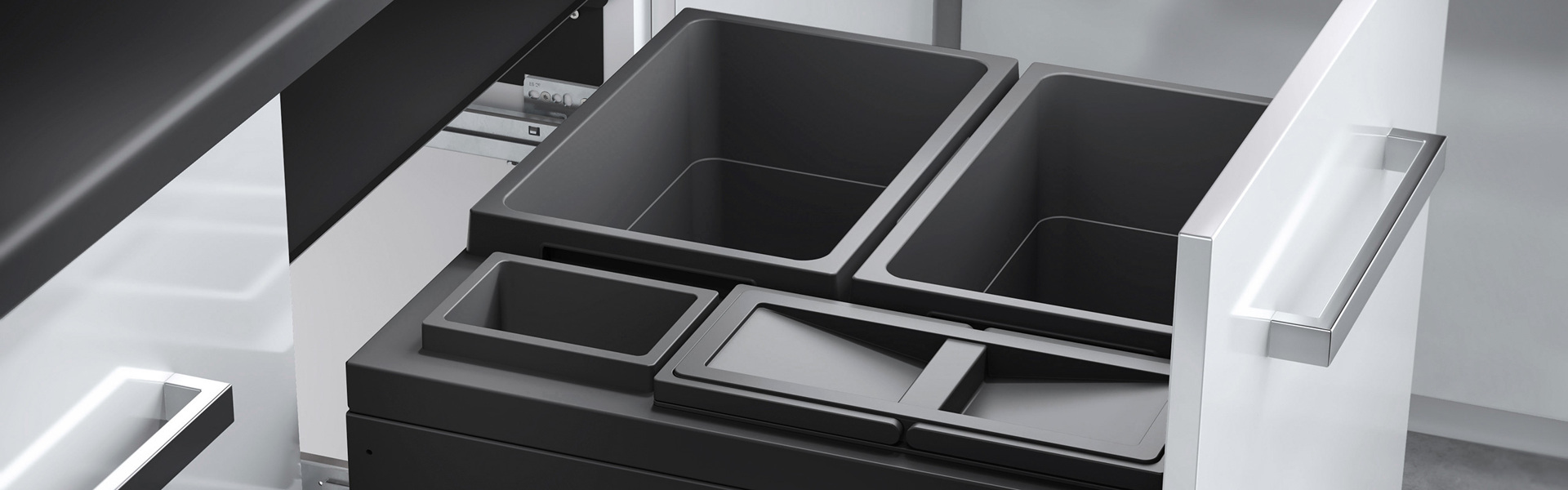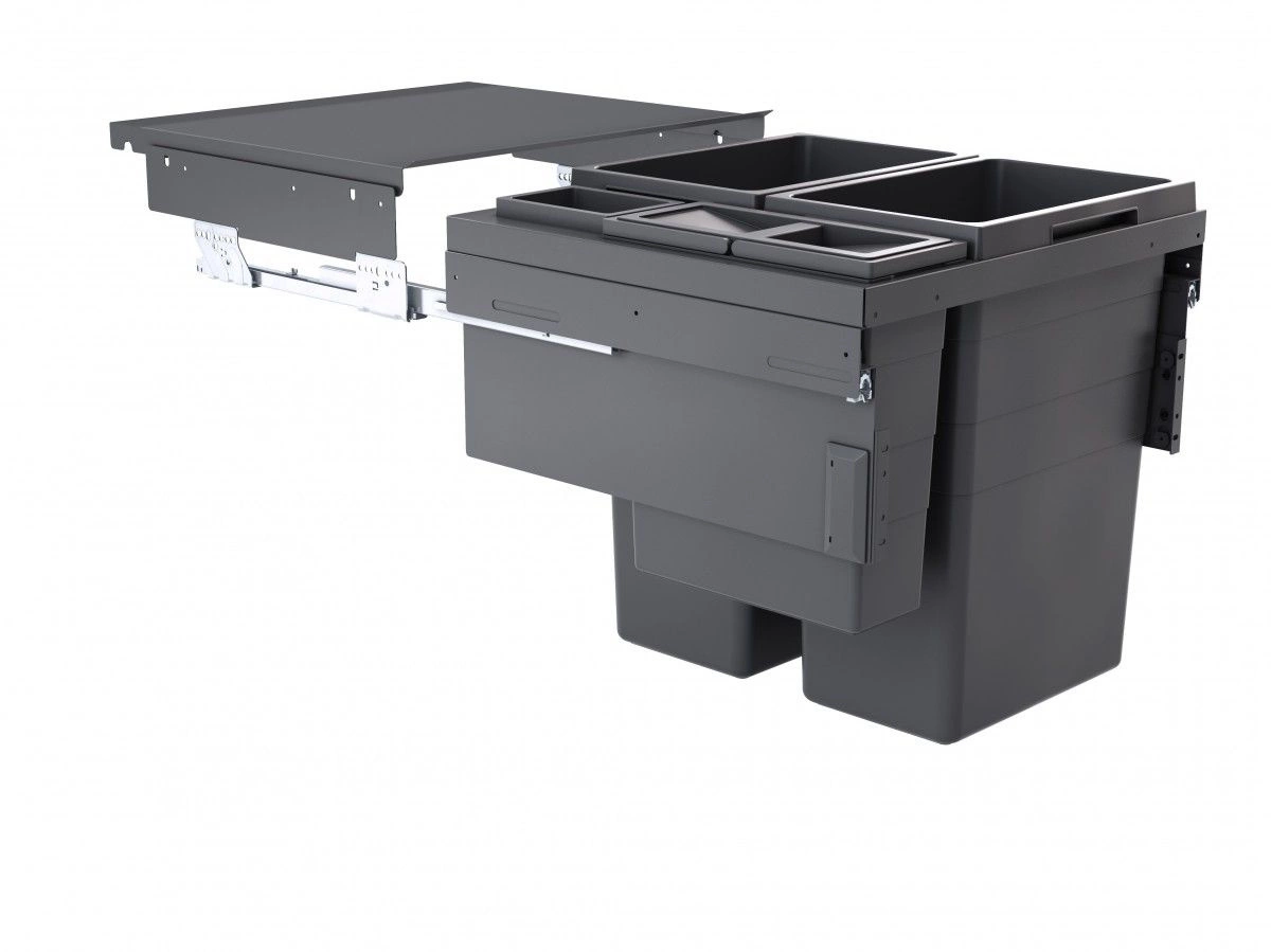 System sortowania odpadów zaprojektowany do szafek kuchennych o szerokości 600 mm, z frontem wysuwnym. Cztery pojemniki: dwa po 38 l, jeden 12 l i jeden 2,5 l. Zamontowany bocznie wewnątrz korpusu, na prowadnicach krytych, z pełnym zsynchronizowanym wysuwem, wyposażonych we własny mechanizm samoczynnego domykania. Idealny do dużych kuchni lub miejsc wymagających rozbudowanego systemu segregacji.