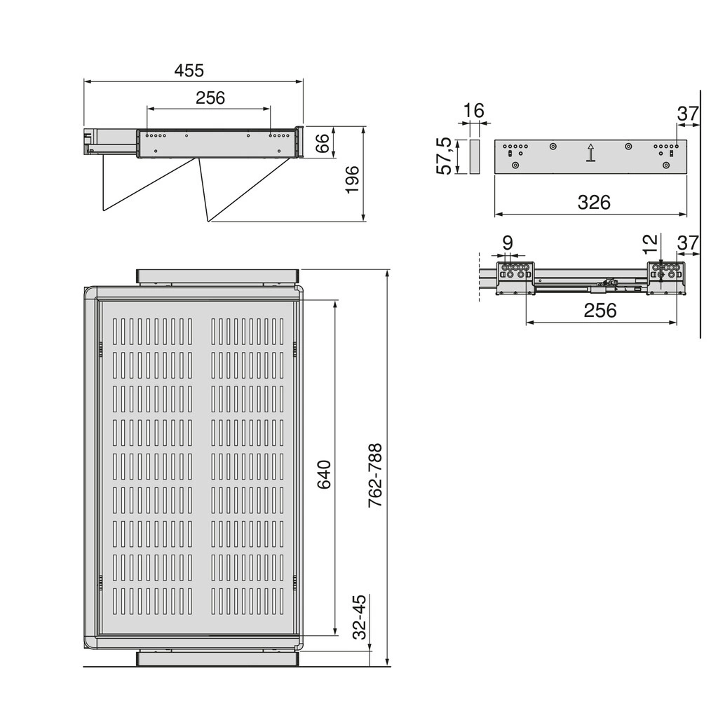 System wyposażony jest w regulację ±13 mm na prowadnicę, co pozwala na dokładne dopasowanie do wnętrza szafy o minimalnej głębokości 460 mm.
