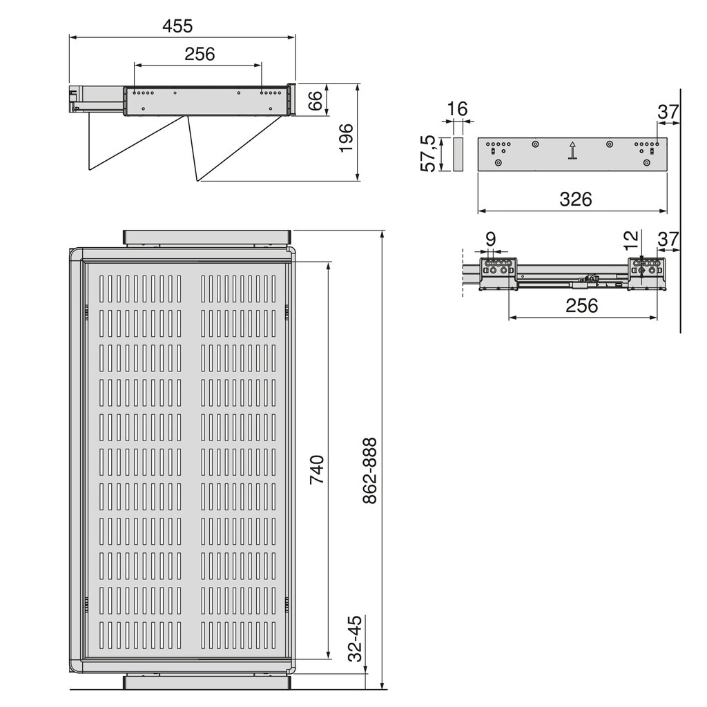 System wyposażony jest w regulację ±13 mm na prowadnicę, co pozwala na dokładne dopasowanie do wnętrza szafy o minimalnej głębokości 460 mm.
