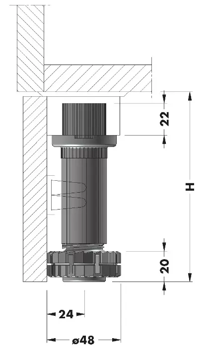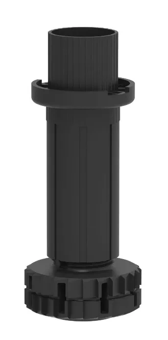 Regulowana nóżka CAMAR SMILE o wysokości 150 mm, przeznaczona do montażu w meblach kuchennych, łazienkowych i korpusowych. Umożliwia precyzyjną regulację wysokości po osadzeniu w korpusie, szczególnie w zabudowach z wysokim cokołem.