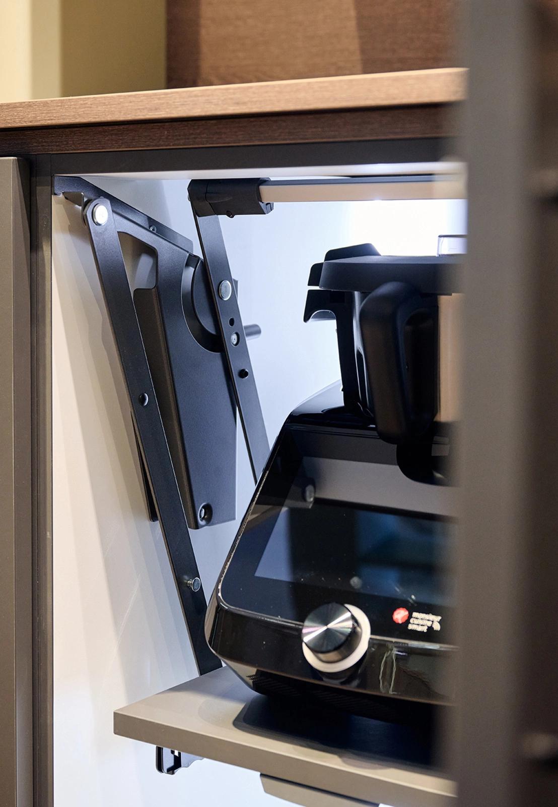 - Ergonomia i Porządek: Uwalnia blat kuchenny od stojących urządzeń, zapewniając efekt "czystej kuchni", jednocześnie eliminując konieczność dźwigania ciężkiego sprzętu z dolnych szafek.