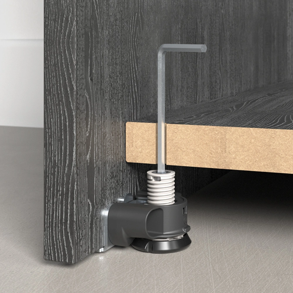 Regulator wysokości przystosowany do wyrównywania ciężkich szaf, regałów i mebli modułowych.